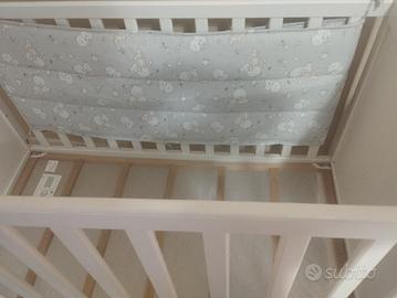 Lettino bambino regolabile in altezza e possibilità di togliere un lato. Sono compresi, nel prezzo, materasso in lattice con aloe vera (pagato 130€), cuscino neonato, 3 coprimaterasso ( tra cui 1 impermeabile) , 2piumoni con lenzuola annesse ( 1 di cotone, 1 di caldo cotone) , 1 copripiumino con piumino e federa, 1 set di paracolpi