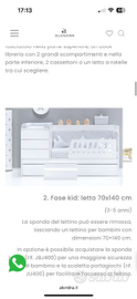 Vendo per cambio cameretta letto trasformabile da 0 a 10+ anni. Primo step lettino neonato 70x140 , con sponda intera che comunque ho in dotazione, e fasciatoio con cassettiera annesso. Secondo step (dai 3 anni circa) lettino con stessa misura di materasso 70x140 con sponda semi aperta per permettere al bambino di salire e scendere in autonomia. Terzo step smontando il tutto diventa una cameretta da letto completa di letto, 70x190, scrivania e due comodini. Vendo completo di materasso, sponde, materassino fasciatoio, paracolpi. Prezzo leggermente trattabile. Pagato tutto completo più di 2000, ho ancora la fattura eventualmente.