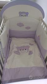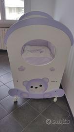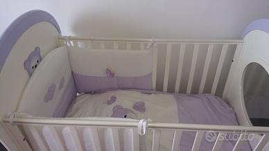 Vendo lettino AZUR maxiOblò con dondolo, modello ORSETTO, bianco e glicine. Dotazioni: - cassettone estraibile - spondine mobili ricoperte da guaina protettiva atossica - dondolo (a cui,in base all'età del neonato, si può decidere di montare le ruote – incluse) - ruote antitraccia, di cui 2 con dispositivo frenante - rete ortopedica in massello di faggio - decorazioni (aerografate a mano) Dimensioni: 86x117x135 Il lettino è in perfetto stato, è venduto smontato (di facile montaggio) e ben imballato. Possibilita' di avere anche della stessa linea, paracolpi, pannello portaoggetti, lenzuola e piumino (per i prezzi contattare)