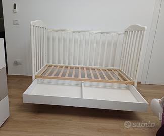 Lettino in legno di faggio doppia altezza (posizione prima nanna sponde mobili), rete a doghe in massello di faggio, ampio cassetto a 2 scomparti, protezione anti morso, ruote piroettanti di cui 2 con freno.