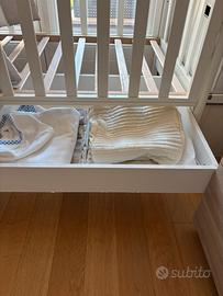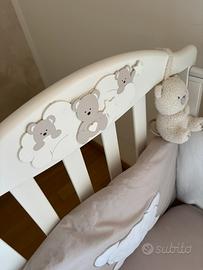 Compreso di materasso, tutto il set corredino lenzuola ad angoli e copripiuminone, paracolpi, carillon.