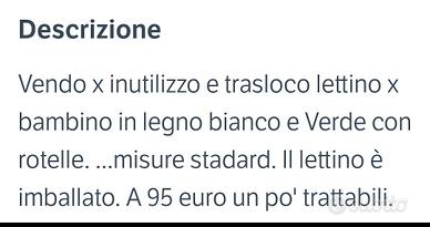 Vendo per inutilizzo e trasloco, lettino baby prima infanzia in legno verde e bianco tenuto ancora molto bene con quattro rotelline, sotto c'è un cassetto contenitore, consegna NO spedizione, vedi la descrizione in foto a 80 euro trattabili