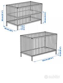 Letto per bambino Ikea, legno di faggio verniciato a smalto atossico all’acqua colore bianco, possobilita regolazione a due altezze, culla e lettino, non incluso materasso, misura 60x120 con sponde fisse.