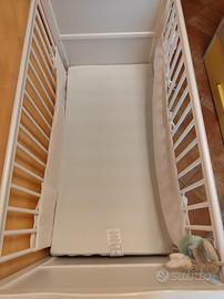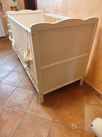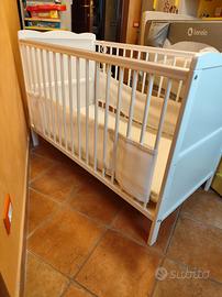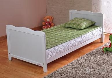 Letto per bambini in legno bianco, completo di materasso in aloe vera sfoderabile, sbarre protettive con 3 livelli di regolazione, trasformabile il letto normale togliendo le sbarre