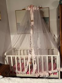 Lettino in legno massello, laccato bianco come nuovo, con materassino mai usato e zanzariera. Ritiro in loco.