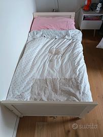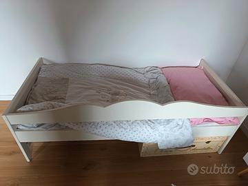 Lettino bambini con spondina removibile, misura 165x76. Facile da montare. Viene fornito assieme al materasso.