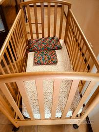 lettino in legno ottimo stato, con sponda abbassabile , completo di materasso coprimaterasso lenzuola e cuscino nuovo mai usato ! (è a casa dei nonni ).