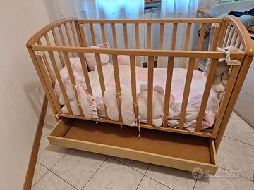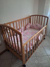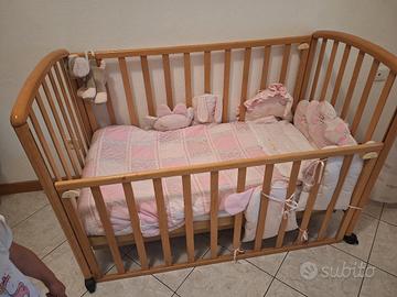 Vendo lettino color legno chiaro completo di materasso e paracolpi adatto anche per maschio. Il lettino è completo di materasso e coprimaterasso con fascia impermeabile.