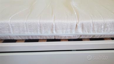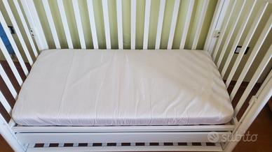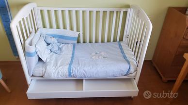 vendo lettino bianco foppapedretti, in buone condizioni, con piano regolabile in altezza, una sponda si può abassare a meta o del tutto, cassetto, materasso "aloe vera" sfoderabile, senza macchie, 4 ruote di cui due bloccabili. in omaggio coperta e paracolpi con fantasia azzurra come in foto, 2 coprimaterasso in cerata, 2 completi lenzuolo in cotone sopra e sotto con federa, altra biancheria da letto