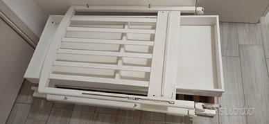 Il lettino è dotato di una sponda regolabile a due altezze, rete con doghe in legno, ampio cassetto (sotto rete) diviso in due scomparti e ruote che ne facilitano lo spostamento per agevolare il riordino del lettino stesso.