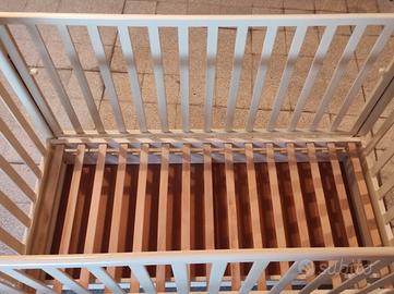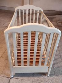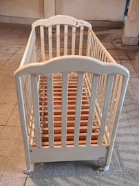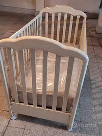 Lettino per neonato bambino Bimbi Italy, robusto in legno color avorio. Sbarre che si possono abbassare su entrambi i lati. 4 ruote per poter spostare facilmente il lettino, due dotate di freno per un sicuro posizionamento. Base per il materasso in doghettato. Comoda cassettiera a due vani. Regalo il materasso . Il lettino è già smontato e pronto per essere ritirato solo a domicilio zona Appio Latino.
