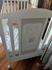 Vendesi lettino bambino, senza materasso, con piumino e copripiumino e un set di lenzuola.