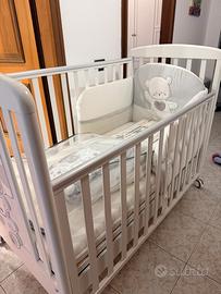 Lettino per bambini Italbaby completo di set materasso, paracolpi, piumone e lenzuola. Le spondine sono mobili, rete a doghe, cassettone con 2 scomparti e ruote con freno. Guaina laterale antimorso. Usato pochissime volte, il set mai usato é ancora imballato.