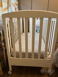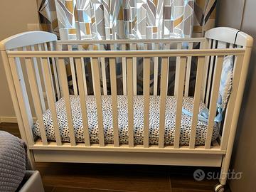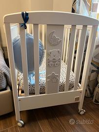 Vendo set completo per bambino composto da lettino Teddy Bear in legno massello e materasso in lattice Marcapiuma. Lettino Modello Teddy Bear, realizzato in legno massello di faggio, robusto e sicuro, con: - 2 spondine mobili (una regolabile e una fissabile) - Guaine paramorsi in PVC senza ftalati - 4 ruote piroettanti (2 con freno) - Ampio cassetto inferiore con doppio scomparto - Struttura con bordi arrotondati, senza spigoli Dimensioni lettino: 70 x 130 x 105 cm (h) Materasso Materasso Marcapiuma: - 100% lattice naturale - Dimensioni 60x120 cm – altezza 12 cm - Rivestimento Aloe Vera sfoderabile - Traspirante e antiacaro - Made in Italy (Il tutto è in ottime condizioni) 💰 Prezzo totale: 200 € Soluzione completa, ideale per chi cerca qualità e comfort per il proprio bambino. Disponibile solo per ritiro a mano in zona Locate di Triulzi (MI), no spedizione