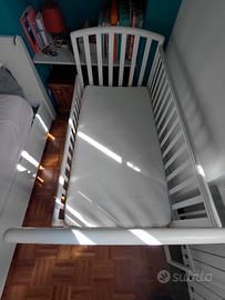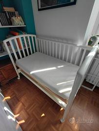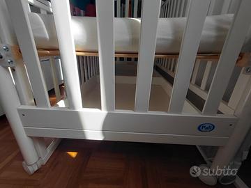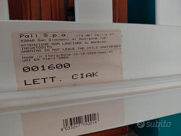 Lettino bambino Pali Ciak. Altezza rete/materasso regolabile in due misure: bassa per oltre i 12 mesi mentre alta per utilizzarlo next-to-me attaccato al lettone. Ruote con freni di sicurezza. Ottime condizioni. Compreso di materasso e di paracolpi laterale. Disponibile da inizio Giugno.