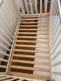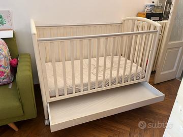 Lettino Pali bianco con sponda abbassabile doppia, molto facile azionare il meccanismo con una sola mano, rete in legno regolabile in 2 altezze, per i bambini più piccoli il materasso sta più in alto per facilitare l’uso, quando stanno in piedi si può mettere la rete più in basso ed evitare che possano uscire da soli. Adatto per bambini dai 6 mesi circa fino ai 3 o 4 anni. Dimensioni del materasso (incluso) 130 cm x 70cm circa, cassettone incorporato, buonissime condizioni generali, ruote funzionanti anche se poco scorrevoli, se non lo dovete spostare spesso vanno bene così altrimenti consiglio di cambiarle oppure semplicemente di toglierle e rendere il lettino fisso. Struttura laccata in color bianco panna, molto leggero e molto facile da montare sono solamente 4 viti lunghe il resto è a incastro. Scambio a mano in città studi (fermata metro verde Piola).