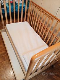 Lettino per bambini in legno chiaro della MIBB, ottime condizioni, usato pochissimo in casa vacanza. Sponde regolabili in altezza o eliminabili. Cassetto per pigiami e biancheria. Piedini con rotelle per facili spostamenti. Regalo paracolpi imbottito e cuscino antisoffoco. Da ritirare in presenza