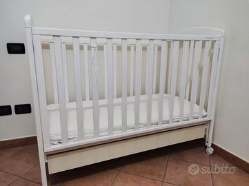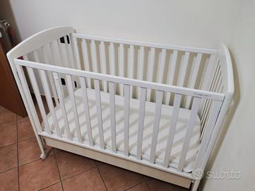 Lettino per bimbo/a fino a 5 anni (altezza 108 cm, lunghezza 131 cm, profondità 73 cm) con sponde una regolabile a due altezze ed un cassetto a scomparsa sotto. Il lettino è dotato di quattro rotelle, ma non girano più. Insieme al lettino forniamo anche il materasso più un copri materasso e 3 lenzuola con gli angoli