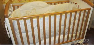 Lettino bimbo in legno con ruote – ottime condizioni, compreso di paracolpi e piumino coordinato