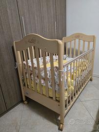 Vendo lettino con sponda regolabile a due altezze per bimbo/a in ottimo stato con cassettiera, incluso materasso e topper antisoffocento. Regalo trapuntina, kit lenzuola con federa e paracolpi come in foto.