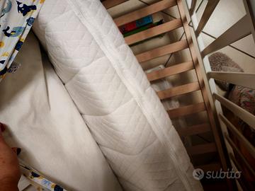 Al lettino è abbinato il materasso antibatterico, sfoderabile e lavabile di dimensioni 124x64 cm con due coprimaterasso impermeabili e il set letto in color tortora composto da piumotto, paracolpi e federa cuscino.