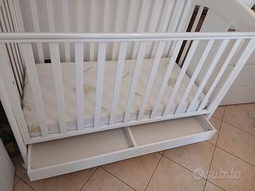 vendo lettino in legno bianco in ottime condizioni per non utilizzo costituito da comoda cassettiera sottostante,rete con doghe in legno e rotelle movibili.prezzo trattabile