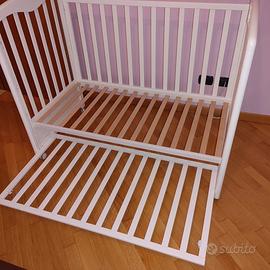 Lettino in legno di faggio con sponda a scomparsa, che può essere posizionata sotto il lettino. In ottime condizioni con cassetto nuovo mai utilizzato.