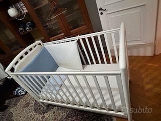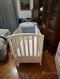 Lettino Foppapedretti usato pochissimo perchè il bambino ha dormito sempre nel lettone. Comprensivo di materasso, paracolpi, cuscino e piumone. Uno dei lati lunghi si può abbassare o eliminare per consentire di attaccarlo al lettone. Possibilità di averlo già montato o smontato.