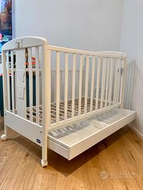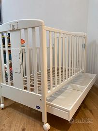 Vendo lettino della Chicco in legno con materasso. Il lettino ha una delle sbarre che si può alzare e abbassare oer maggiore comodita.