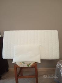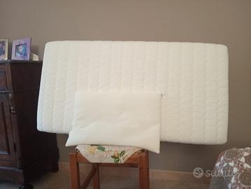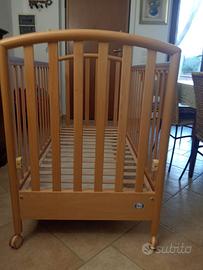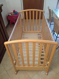 Letto in legno solido, dotato di una spondina regolabile in altezza; la rete è a doghe, mentre nella parte inferiore si trova un praticissimo cassetto estraibile, che potrà contenere tutti i corredini di ricambio. Materasso praticamente nuovo e cuscino inclusi nel prezzo