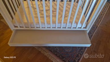 lettino color bianco crema, con cassetto per biancheria e 4 ruote dotate di freno, entrambe le sponde si possono abbassare, marca Pali piccoli segni sulla vernice. Materasso sfoderabile e lavabile, marca Pali, come nuovo perchè usato poche volte per casa di vacanza