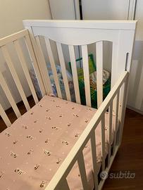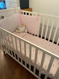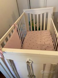 Lettino legno bianco con inserti ecru Nanan, con paracolpi e copripiumimo Nanan ROSA e materasso nuovo
