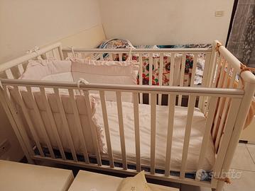 lettino con comode rotelle che si possono bloccare. tra i miei annunci puoi trovare anche il materasso con coprimaterasso e lenzuolo ad angoli,volendo ho anche diversi paracolpi color giallo (completo di lenzuola ,federa cuscino,,piumino e copripiumino) o rosa ( con lenzuola abbinate)