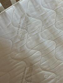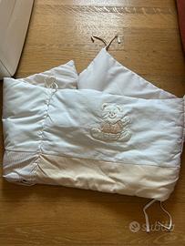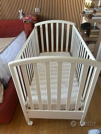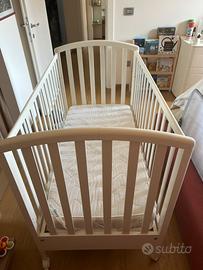 Lettino con sbarre bianco con sbarra che si abbassa, piu materasso, paracolpi e lenzuola!! Con cassetti sotto!! Tentuto molto bene!!