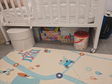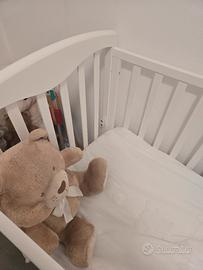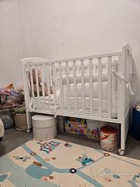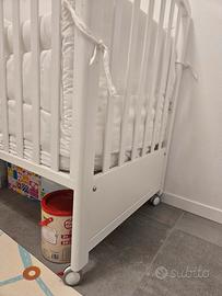Vendo lettino con sbarre Foppapedretti completo di materasso, paracolpi, cuscino e cassettone inferiore (non presente in foto perché smontato) Usato poco quindi ancora in ottimo stato Nessun graffio o segno sulla struttura Corredato di 4 ruote per muoverlo comodamente