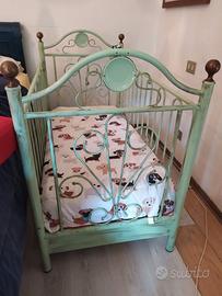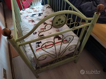 Vintage, in ottimo stato, presente anche il materasso, pulito in quanto ho lavato il rivestimento. Il materasso è coperto da cellophane. Regalo paracolpi azzurro chiaro che si vede nelle foto. VENDITA SOLO DI PERSONA. NON SPEDISCO