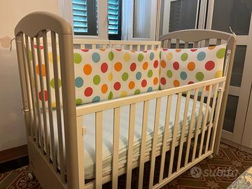 Lettino con sbarre, di cui una può essere abbassata anche completamente. Dispone di rotelle per essere spostato, con possibilità di blocco. In ottime condizioni, con cassettone sottostante. Vendo completo di materasso.