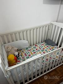 Lettino con sponda regolabile, materasso e paracolpi. Presente cassettone e ruote.