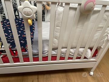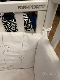 Lettino foppapedretti con rotelline sponda regolabile in altezza e staccabile per, due altrzze letto, completo di materasso, paracolpi, copri materasso cerato, set lenzuola