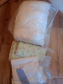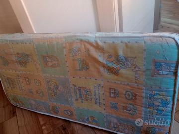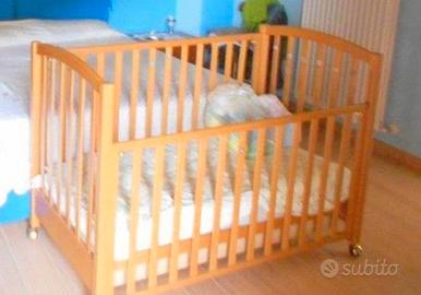 Lettino per bambini, con sponde ad altezza regolabile. È presente un cassetto estraibile sotto alla rete. Facile da spostare (ha le ruote) e da montare. Comprensivo di materasso, due confezioni di lenzuola(bianche e gialle), un piumino con copripiumino e paracolpi in tinta coordinata (verde con orsetti). Compreso anche un seggiolino per auto marca CAM (alzata con schienale, da 100 a 150 cm)