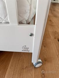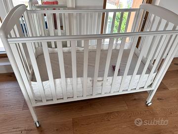 Lettino con sponde Italbaby modello Teddy. Realizzato in massello di faggio, colore bianco. Sponde con spigoli arrotondati, cassettone e ruote piroettanti di cui due con freno. Materasso incluso. Made in Italy. Usato poco. Dalla nascita fino ai 3 anni.