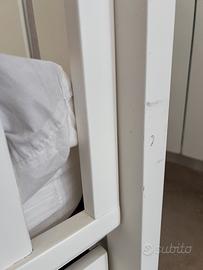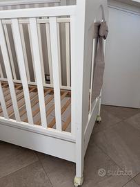 Lettino con sponde Natan tato con fiocco ecru e ruote, colore bianco, normali segni di usura ma tenuto benissimo, compreso libretto di istruzioni e materasso usato pochissimo e sempre tenuto con coprimaterasso impermeabile, dotato di cassettone, Dimensioni: 132x74x110 cm, sponde che si possono abbassare, possibile invio di altre foto