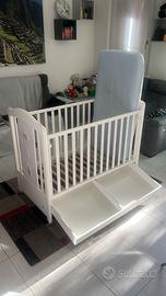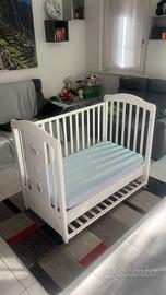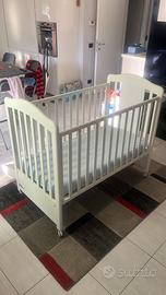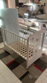 Lettino con sponde in ottimo stato. La sponda si può abbassare circa a metà altezza o riporre sotto il lettino. Materasso e coprimaterasso antisoffoco inclusi.
