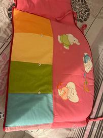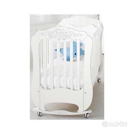 Lettino bianco e argento usato ma seminuovo, con decorazioni Swarovski. Possibilità di metterlo con le rotelle o dondolo. Presente cassettone sotto, molto capiente. Insieme regalo: cuscino antisoffoco, due kit di paracolpi, copripiumino, federa, trapunta, proiettore di stelle con musiche per la notte da attaccare alla sponda.