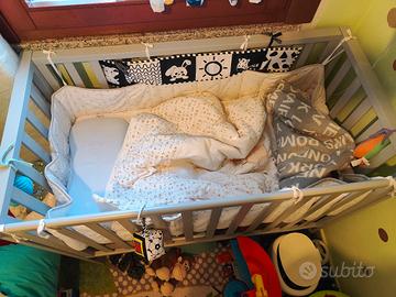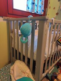 Lettino Contact Azzurra Design grigio con sponda a scomparsa e ruote (piroettanti e bloccabili), comprensivo di materasso. Può essere utilizzato come "next-to-me" fianco-letto. Rete a doghe regolabile su 3 altezze e materasso con rete inclinabile antireflusso. Dimensioni lettino: L.62,5 – P.117 – H.96 cm. Dimensioni materasso: L.51 – P.108 cm. Il lettino è in ottime condizioni, prezzo di vendita nuovo circa 400€, si vende a 170€.
