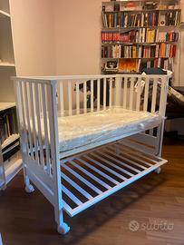 Come nuovo, usato molto poco. In vendita gia smontato con scatola e materasso, ritiro di persona. Contact, è un letto versatile in grado di diventare culla, lettino o divanetto. Grazie anche alla sponda a scomparsa, Contact è facilmente affiancabile al letto degli adulti per avere sempre il tuo bimbo accanto. CARATTERISTICHE: Utilizzabile dalla nascita. Vernici atossiche a base di acqua. Distanza tra le stecche anti-intrappolamento. Rete regolabile su 3 altezze per un sicuro accostamento al letto dei grandi, distanza tra pavimento e parte superiore del materasso: 46 cm. 53 cm. 61 cm. Rete a doghe massello di faggio. Ancoraggio: coppia di cinghiettine per fissare il lettino al letto matrimoniale incluse. 4 ruote piroettanti e bloccabili. Blocco di sicurezza della sponda a due movimenti affinché il bambino non corra alcun pericolo. Dimensioni: L.62,5 – P.117 – H.96 cm. Dimensioni materasso: L.51 – P.108 cm. Materasso: sfoderabile, traspirante, ortopedico, antiacaro, fatto in Italia. Sistema antireflusso: rete reclinabile antirigurgito