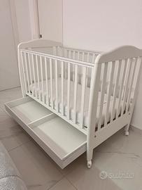 Il lettino possiede anche il cassetto estraibile in basso per porta vestitini/oggetti in piu ha anche le barre di protezioni laterali regolabili in altezza.
