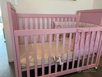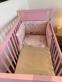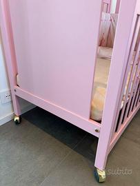 Vendo Lettino realizzato in legno naturale MDF laccato con vernice atossica a base d'acqua colore rosa con protezioni . Dotato di 4 ruote dorate con freno. Doghe regolabili in 2 diverse posizioni. Linea semplice e moderno impreziosito dall'iconico Wiking Eye inciso. Progettato all'insegna della comodità e praticità. Stecche posizionate in modo da non creare alcun pericolo. DIMENSIONE: 130 x 70 x 101 H Cm.