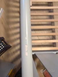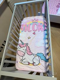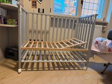Azzurra Design Lettino Contact Art Lettino creato con materiali e tinte certificate Eco-Kids per garantire un prodotto con tinte atossiche e sicure. Caratteristiche: Lettino con base materasso regolabile in altezza su 3 posizioni. Spondina mobile. Per facilitare la movimentazione, il lettino ha 4 ruote piroettanti con freno. Incluso con il lettino: - Materasso: sfoderabile, traspirante, ortopedico, antiacaro, fatto su misura da Samor negozio specializzato nella produzione di materassi. - Sistema antireflusso: rete reclinabile antirigurgito. Segnalo una lieve sverniciatura su un punto del lettino, puramente estetica. Misure lettino: cm. 62,5x117x96 h. Misure materasso: cm. 54×107 Finiture colore: Bianco, Avorio, Grigio, Avana