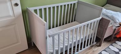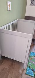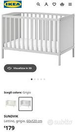 Lettino/cullla Ikea Sundvik grigio chiaro, in legno, completo di materasso in schiuma adatto al lettino. Prodotto come nuovo, tenuto benissimo (no graffi o segni di colla), dim. 60x120 cm. Piano regolabile in altezza per bimbi più piccoli e possibilità di rimuovere una delle due barre laterali lunghe per trasformarlo in lettino.